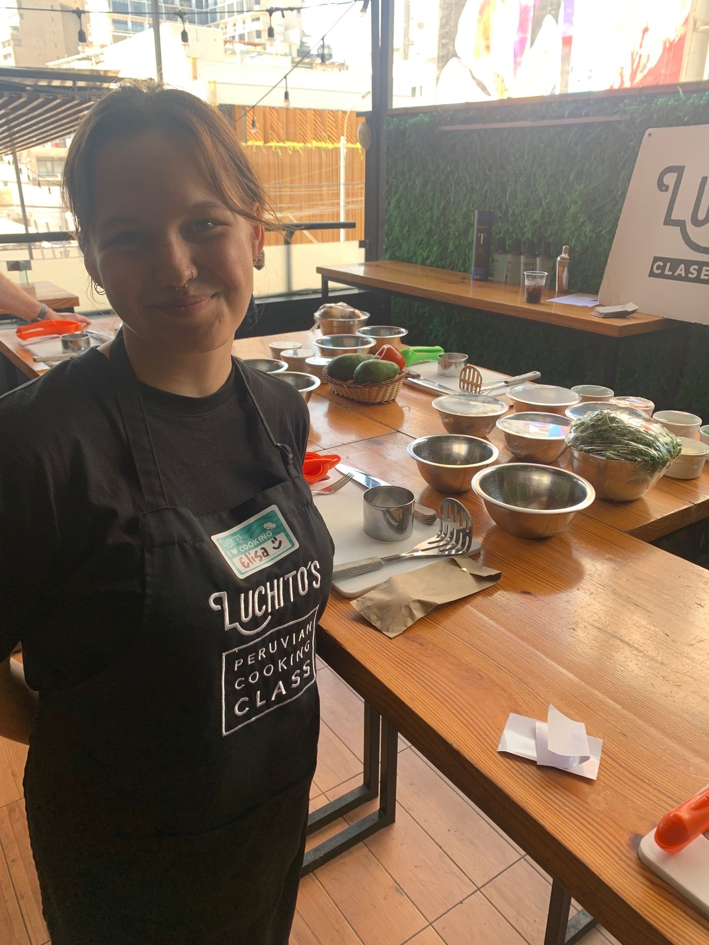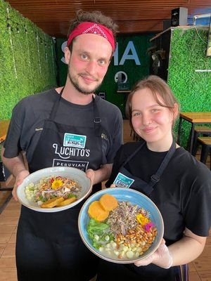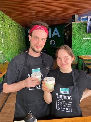 Der Kochkurs war toll! Der Kursleiter hieß George und hat sehr viele gute Laune mitgebracht. Außer uns hat noch ein Pärchen aus England den Kurs mitgemacht, die ebenfalls sehr lustig waren. Wir haben erst Causa gekocht, ein geschichtetes Gericht aus Kartoffeln, Geflügel (für uns grüner Spargel und Tomate) und Avocado. Danach haben wir einen Pisco Sour zubereitet, einen sehr leckeren Cocktail mit Eiweiß, der aber nicht danach schmeckt und zuletzt ein Ceviche, ursprünglich mit Fisch, den wir durch Champignons ersetzt haben. Alles hat sehr viel Limette enthalten und war unglaublich lecker!