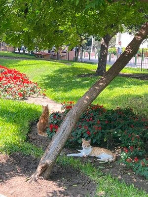 Nach sehr vielen unbequemen Stunden in drei verschiedenen Flugzeugen waren wir froh das Hotel direkt am Flughafen gebucht zu haben. Wahrscheinlich wird das die luxuriöseste Unterkunft unserer ganzen Reise gewesen sein. Den ersten richtigen Tag in Lima haben wir vor allem damit verbracht von einer Unterkunft zur nächsten zu kommen. Am zweiten Tag allerdings hatten wir einen Kochkurs gebucht. Um dort hinzukommen haben wir erst unsere großen Rucksäcke beim Busunternehmen abgegeben und sind dann eine Stunde durch Lima gelaufen, unter anderem durch den Kennedy Park in Miraflores, der auch Katzenpark genannt wird, weil dort unglaublich viele Katzen leben, alle mit kleinem Schlafplatz und Futterstellen. Innerhalb dieser einen Stunde, oder lass es vielleicht zwei gewesen sein, hat Niklas sich einen unglaublichen Sonnenbrand im Nacken eingefangen, der ihn immer noch leiden lässt.