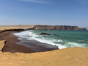 Am nächsten Tag hatten wir vor den Nationalpark von Paracas mit einem gemieteten Roller zu erkunden. Gesagt getan. Der Roller war zwar nicht mehr der Neuste, hat uns aber sicher von Aussichtspunkt zu Aussichtspunkt gebracht. Dieser Tag hat uns besonders gut gefallen, weil wir alles in unserem eigenen Tempo machen konnten, anders als bei den geführten Touren, und die Landschaft sehr eindrucksvoll war. Wie eine kleine Wüste, die in einer Steilküste am Meer endet. Dazwischen immer wieder Strände. Unter anderem der Playa Roja, an dem man nicht baden sollte, der aber trotzdem sehr beeindruckte durch seine Farbe und die Felsen im Hintergrund.