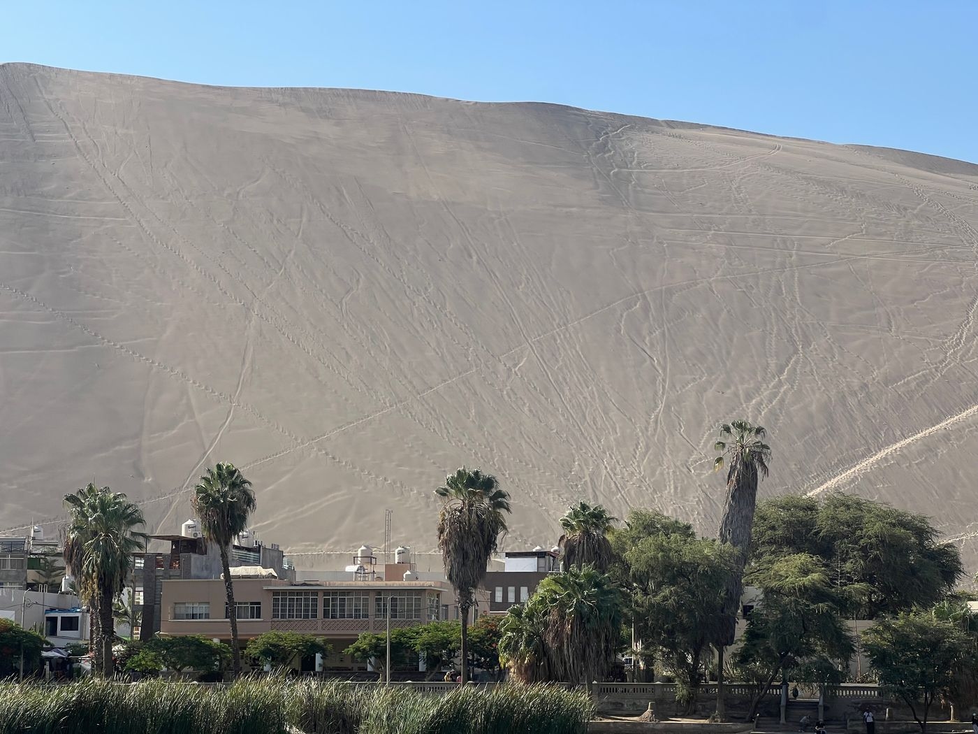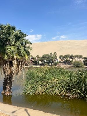 Für den nächsten Tag hatten wir eine Tour nach Huacachina gebucht, einer kleinen Oase, die ca 1 1/2 Stunden entfernt lag. Dort wollten wir eigentlich weiter in die Dünen fahren um dort Sandboarding zu machen. Ich hatte aber leider keine Vomex vor der Busfahrt genommen und musste mich zwar nicht übergeben, habe aber doch gelitten. Vor allem auch, weil es so heiß war und die Klimaanlage nur Niklas getroffen hat, dem eh schon kalt war. Wir kamen erst am Ende der Fahrt darauf Plätze zu tauschen.